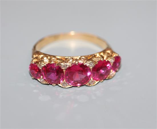 Lot 726 , A yellow metal, graduated synthetic ruby and diamind chip set half hoop ring, size N/0.