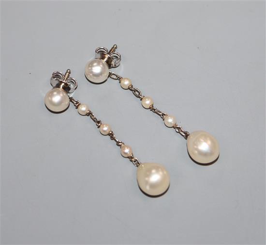 A pair of white metal and cultured pearl set drop earrings, 39mm.