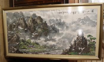 Lot 1451 , Japanese School, watercolour and gouache, Mountain landscape with cranes flying above a river, 78 x 158cm