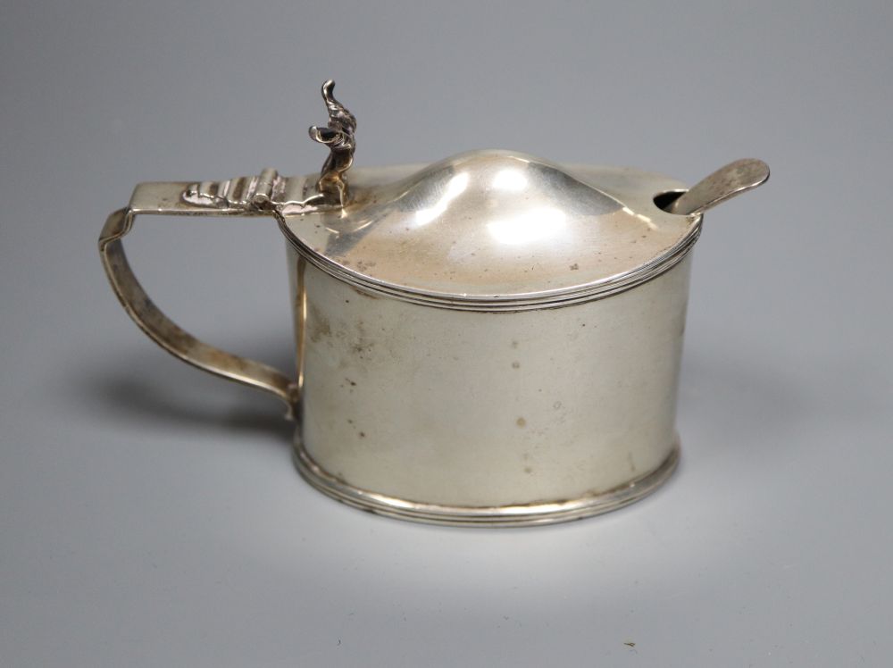 An Edwardian oval silver lidded mustard pot and matching spoon, Stokes & Ireland, Chester, 1905, with blue glass liner, 118 grams.