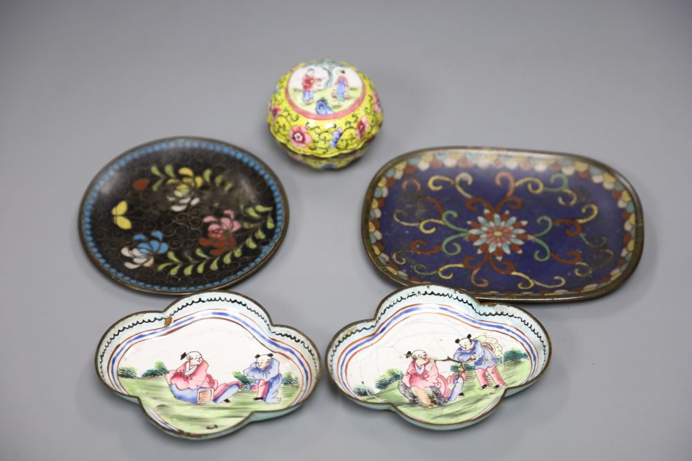 Two Chinese Canton enamel dishes and a lidded pot, and two cloisonne dishes