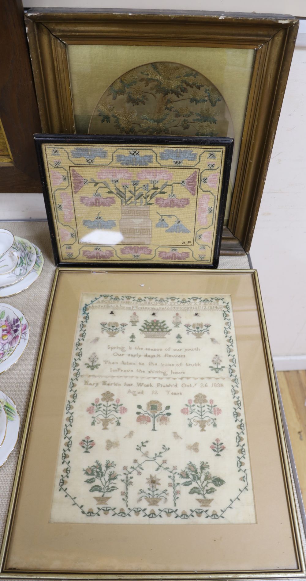An 1836 cross-stitch sampler, a petite point picture and a Regency silk work picture (3)