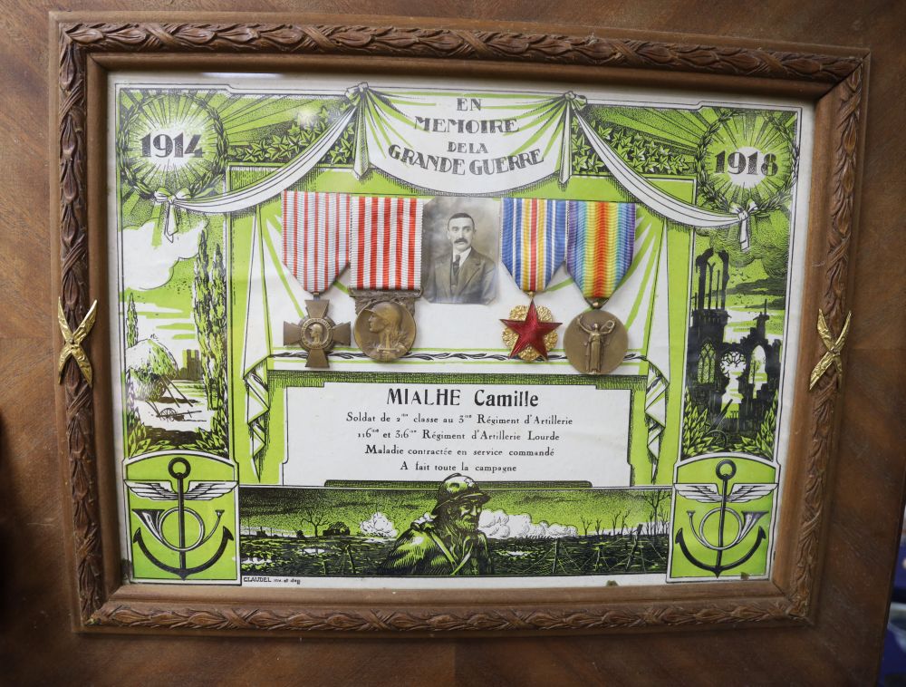 Lot 484 , A French medal group: Camille Mialhe: Combatants Cross, Commemorative war medal, medal for War Wounded and Victory medals