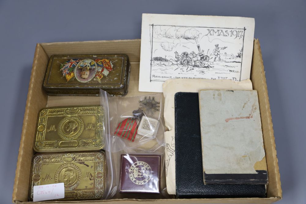Two WWI soldier's notebooks with caricatures, three tins, King's Badge, BEM brooch, Croix de Guerre
