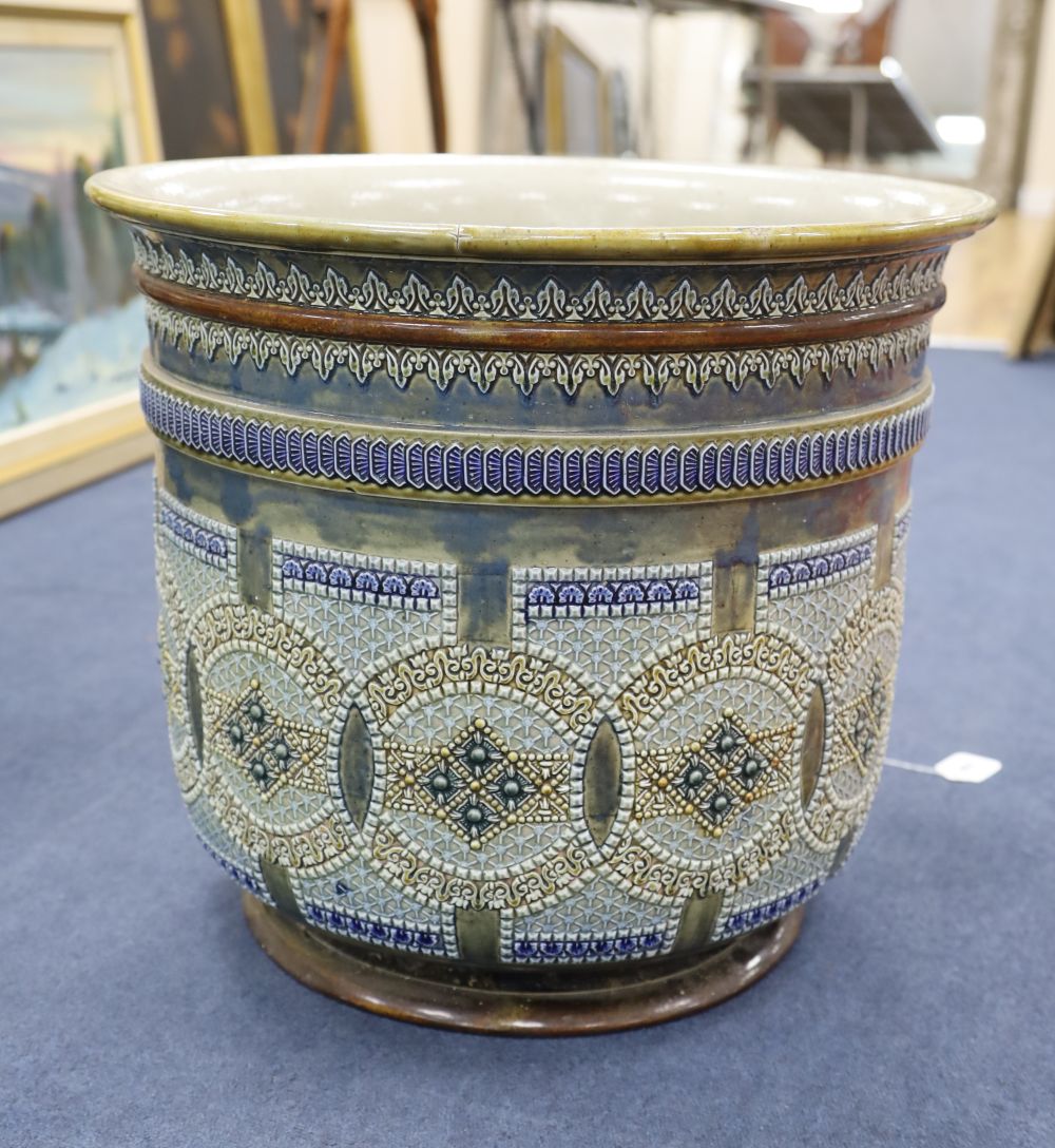 A massive Doulton Lambeth jardiniere, dated 1883, height 46cm