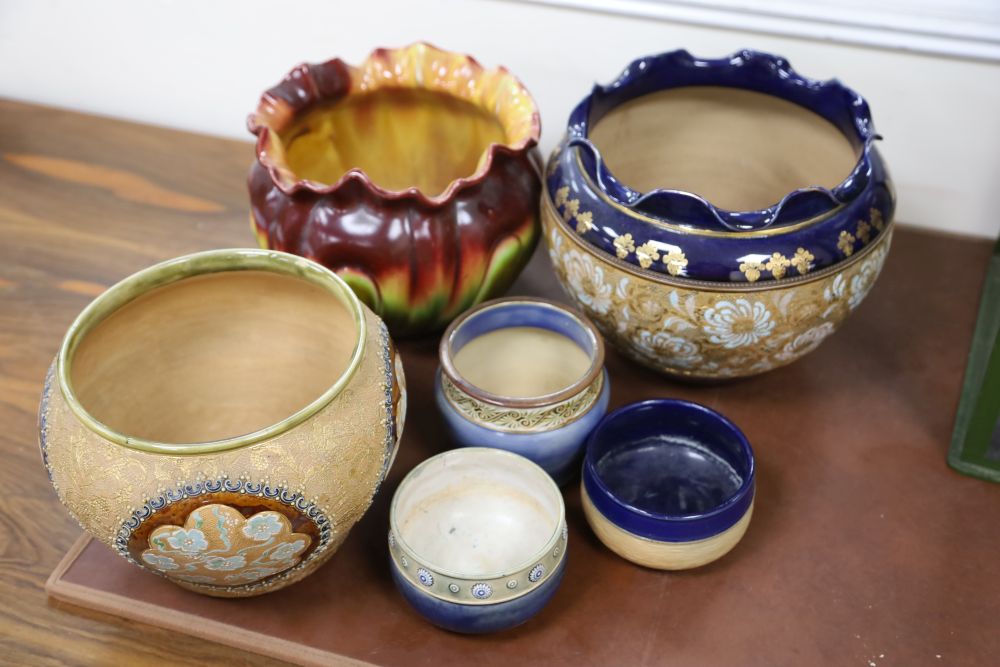 Lot 458 , Two Doulton stoneware jardinieres, three similar small pots and a Bretby jardiniere (6)