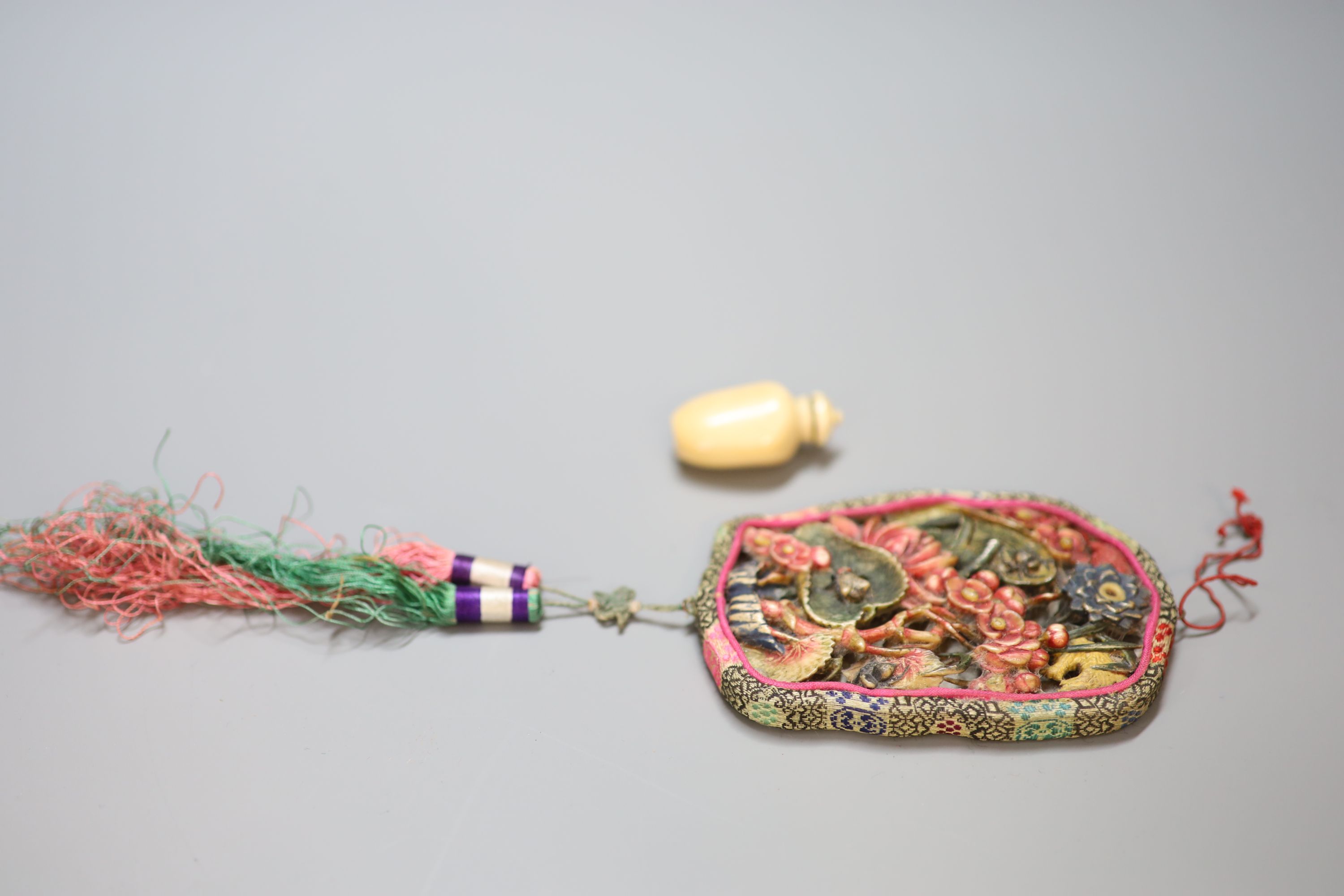An early 20th century Chinese carved ivory or horn plaque mounted as a mirror, within a silk braided frame, and carved with flowers and lily pads, and a small ivory snuff bottle