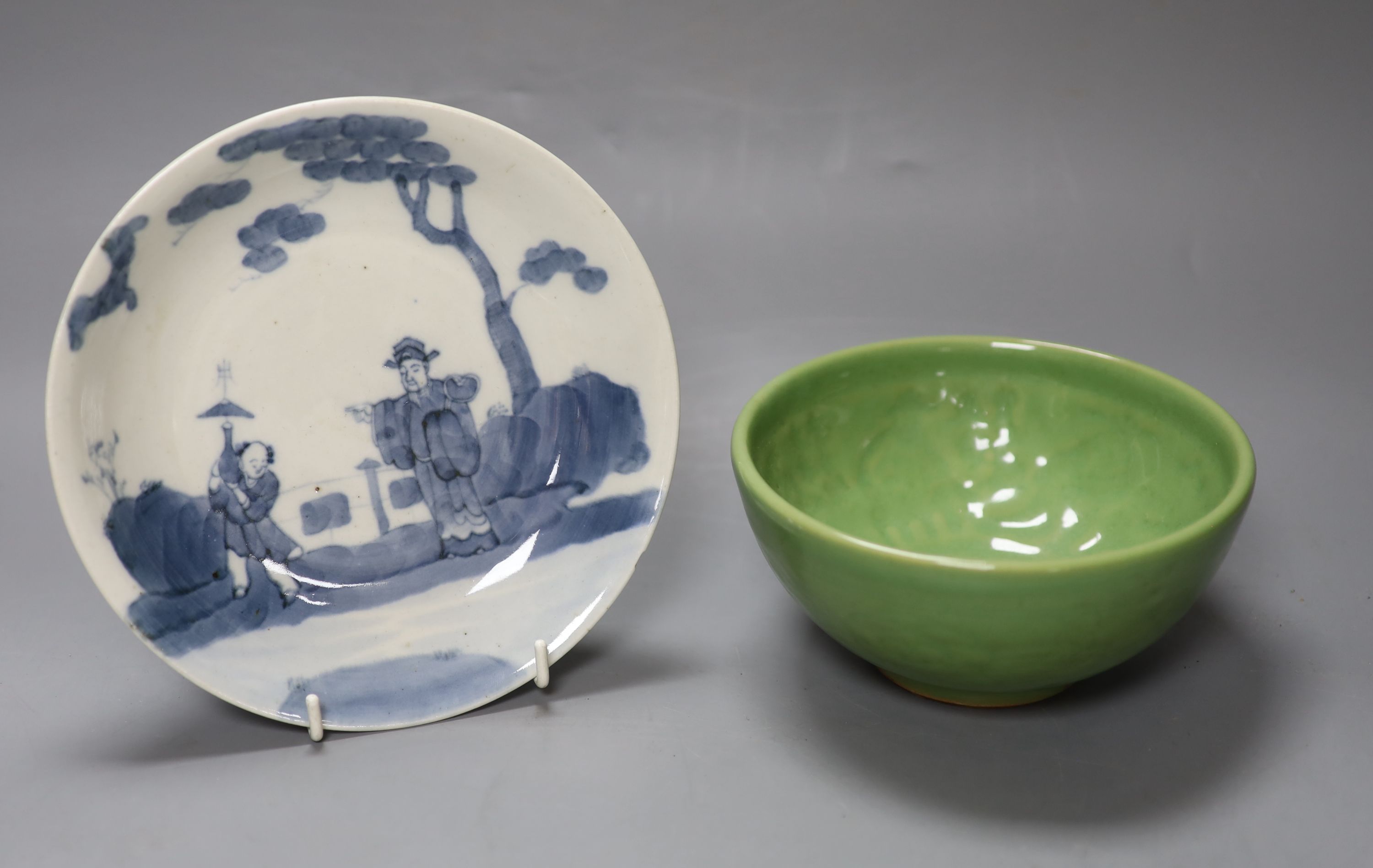 A Chinese blue and white dish, diameter 18cm, and a green glazed bowl