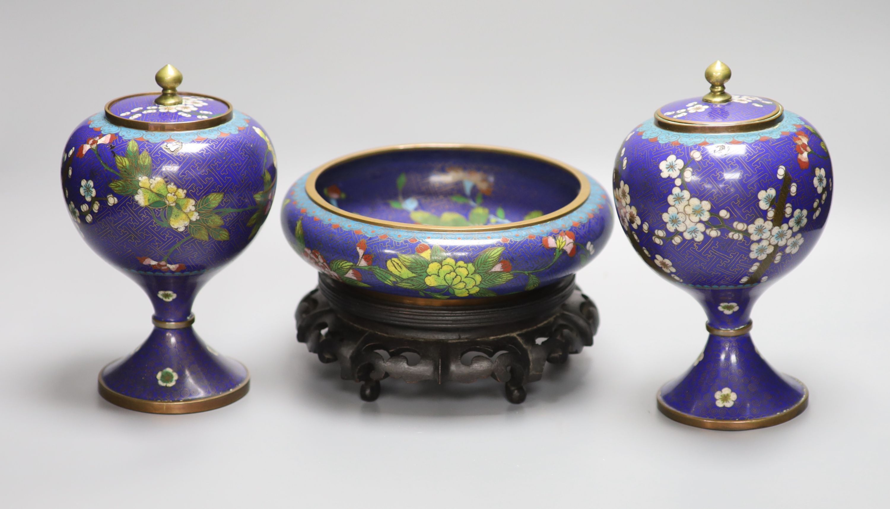 A pair of early 20th century Chinese cloisonne enamel jars and covers and a similar bowl and wood stand, tallest 20cm