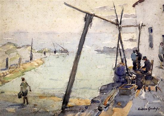 Andrew Archer Gamley (1869-1949), watercolour, Fishermen on the quay, signed, 27 x 37cm