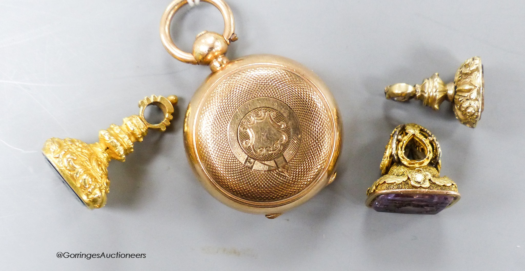 Lot 894 , A gold plated sovereign case and three assorted yellow metal overlaid and gem set fob seals (one a.f.) including two with carved matrix, largest 26mm.