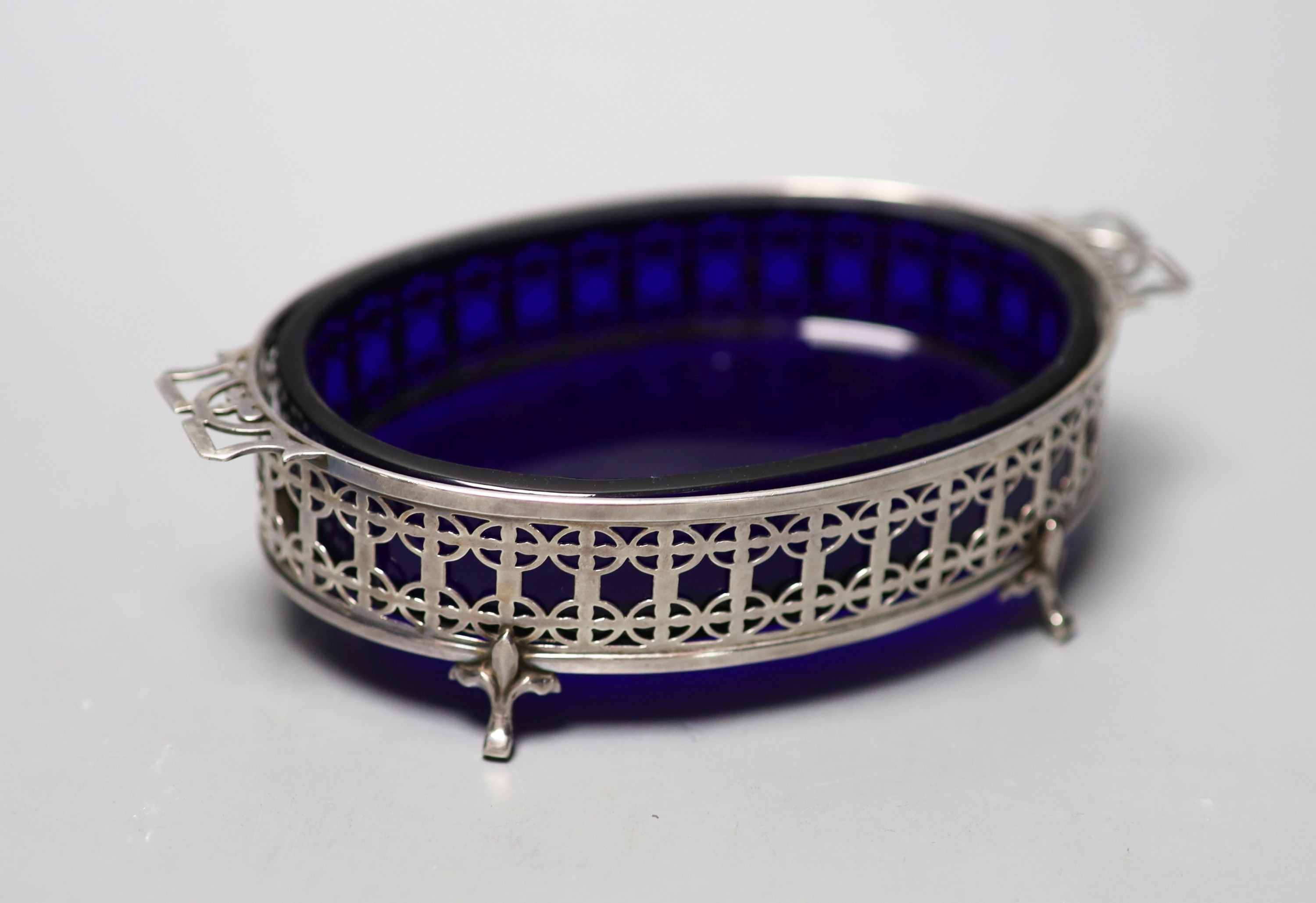 Lot 1800 , A George V pierced silver oval two handled butter dish, with blue glass liner, Adie Brothers, Birmingham, 1927, 13.3cm over handles.