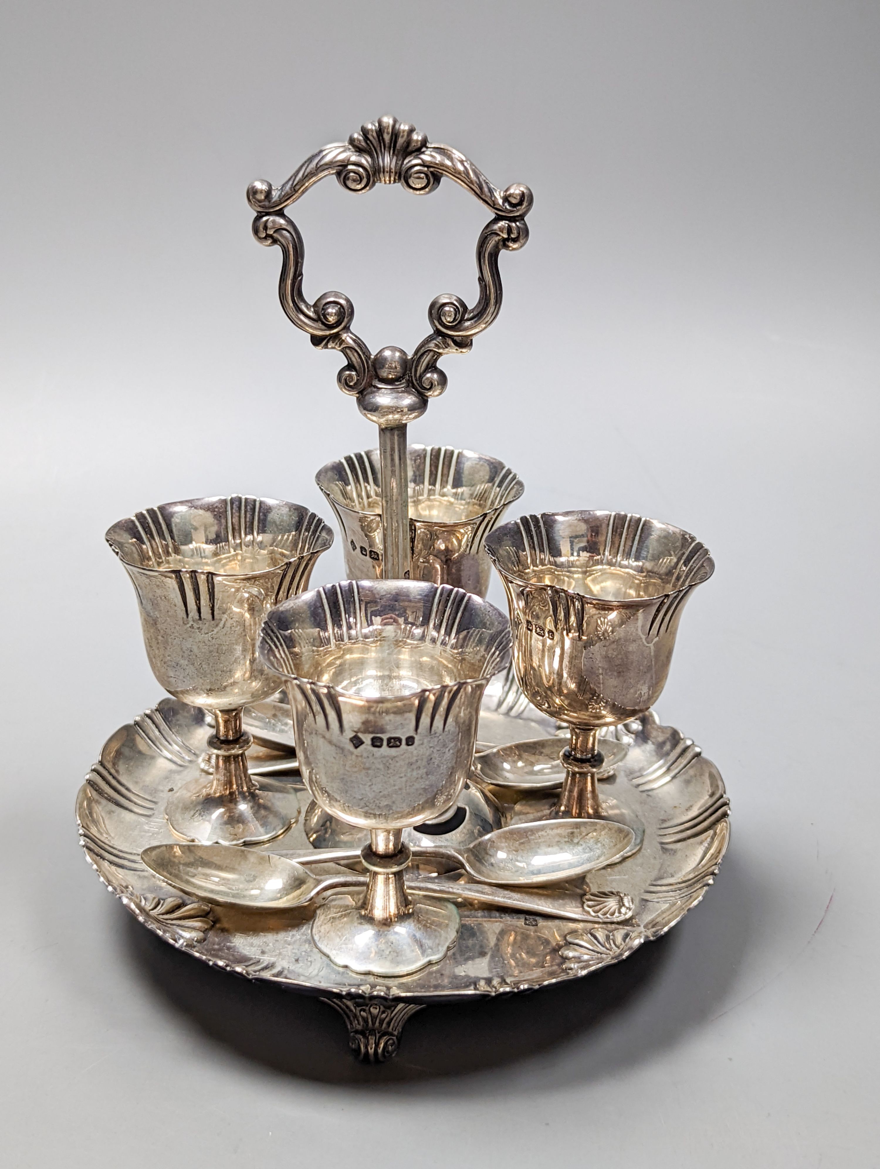 A late Victorian silver egg cruet,, with four cups and four associated spoons, Martin, Hall & Co, Sheffield, 1895, height 18.2cm, 18oz.
