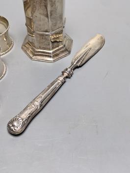 A set of six George V silver napkin rings, Birmingham, 1915, a silver sugar caster and silver butter knife.