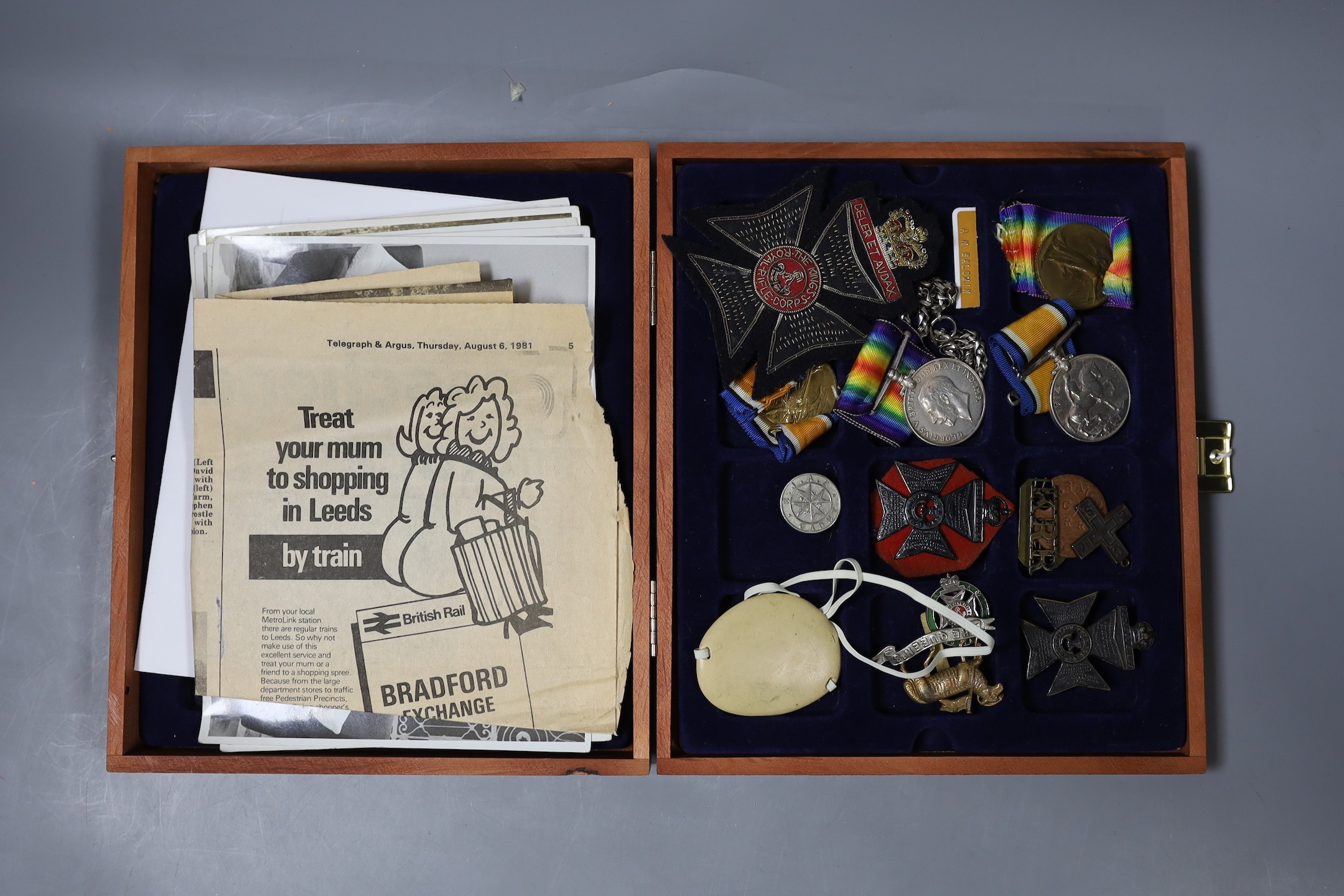 WWI medals, G-13741 PTE. W. H MEARS. THE QUEEN’S R. and 44366 PTE. A. N. BALDWIN. K. R. RIF. C. together with other military badges, photos of Arthur Baldwin on an episode of This Is Your Life on the BBC