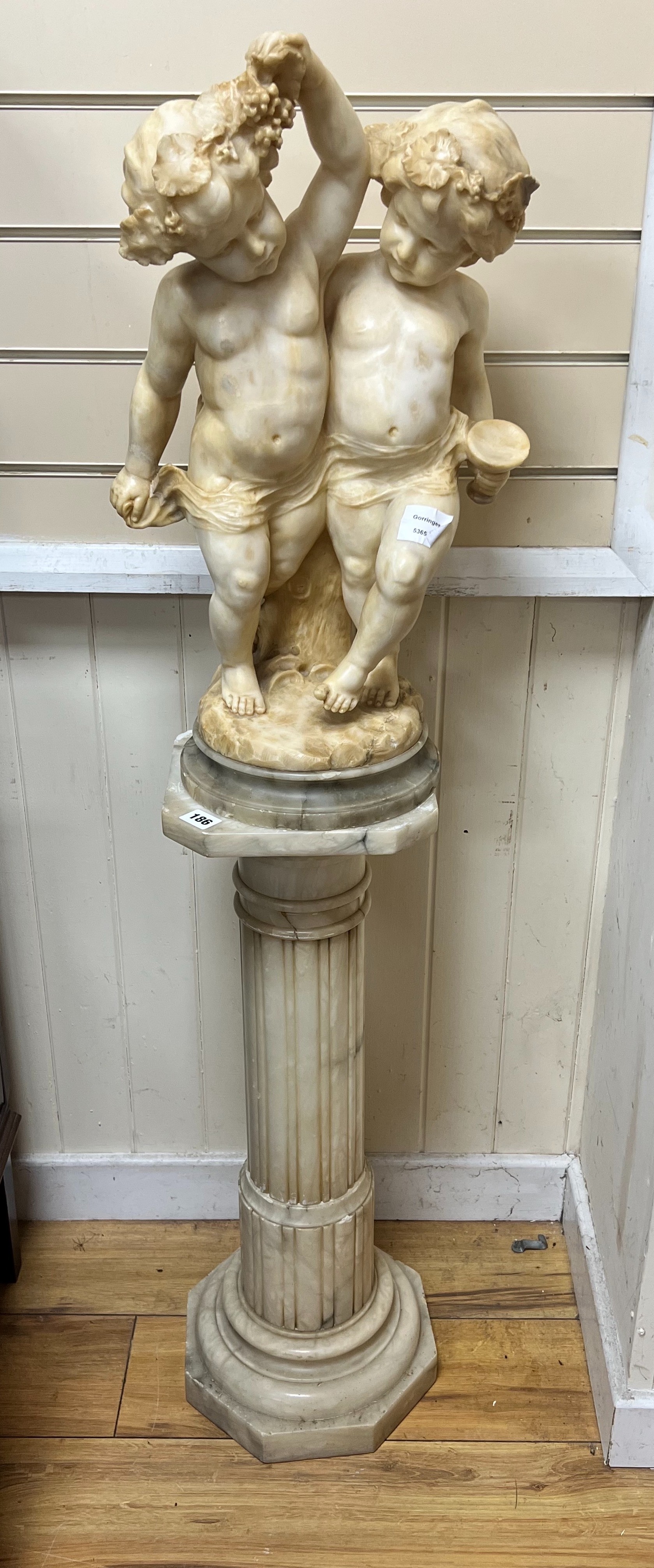An Italian alabaster carving of bacchic cherubs on fluted pedestal, overall height 130cm