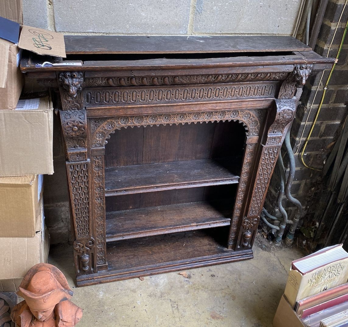 A 19th century Flemish carved oak open wall cabinet, width 91cm, depth 26cm, height 94cm