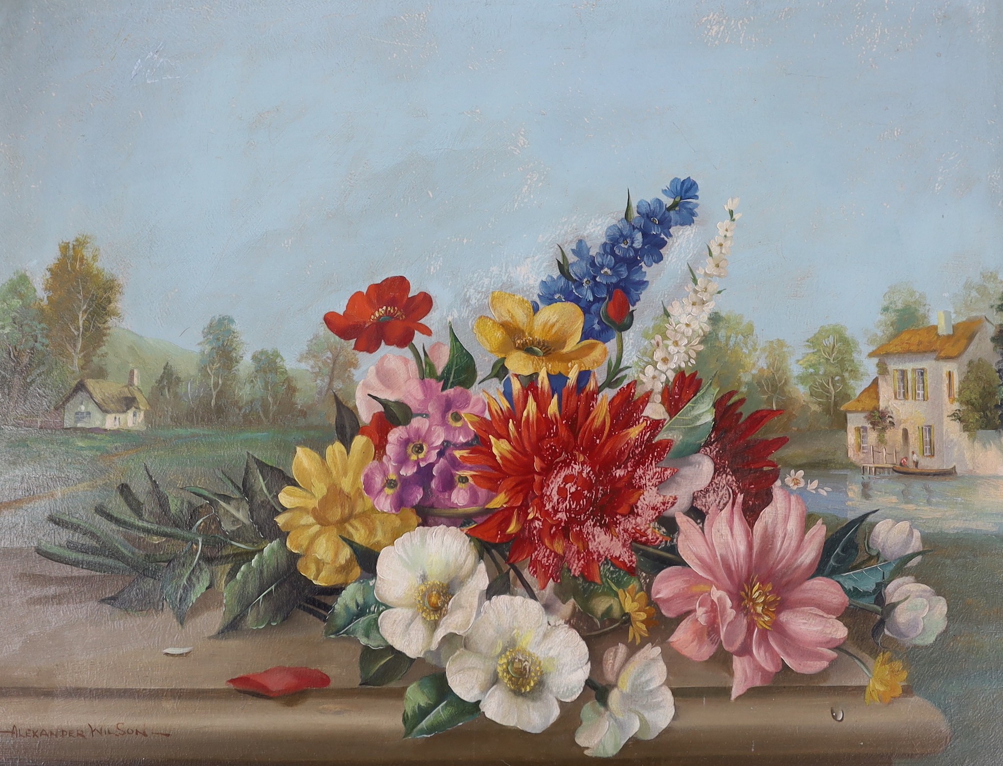 Alexander Wilson, oil on board, Still life of flowers in a landscape, signed, 37 x 48cm