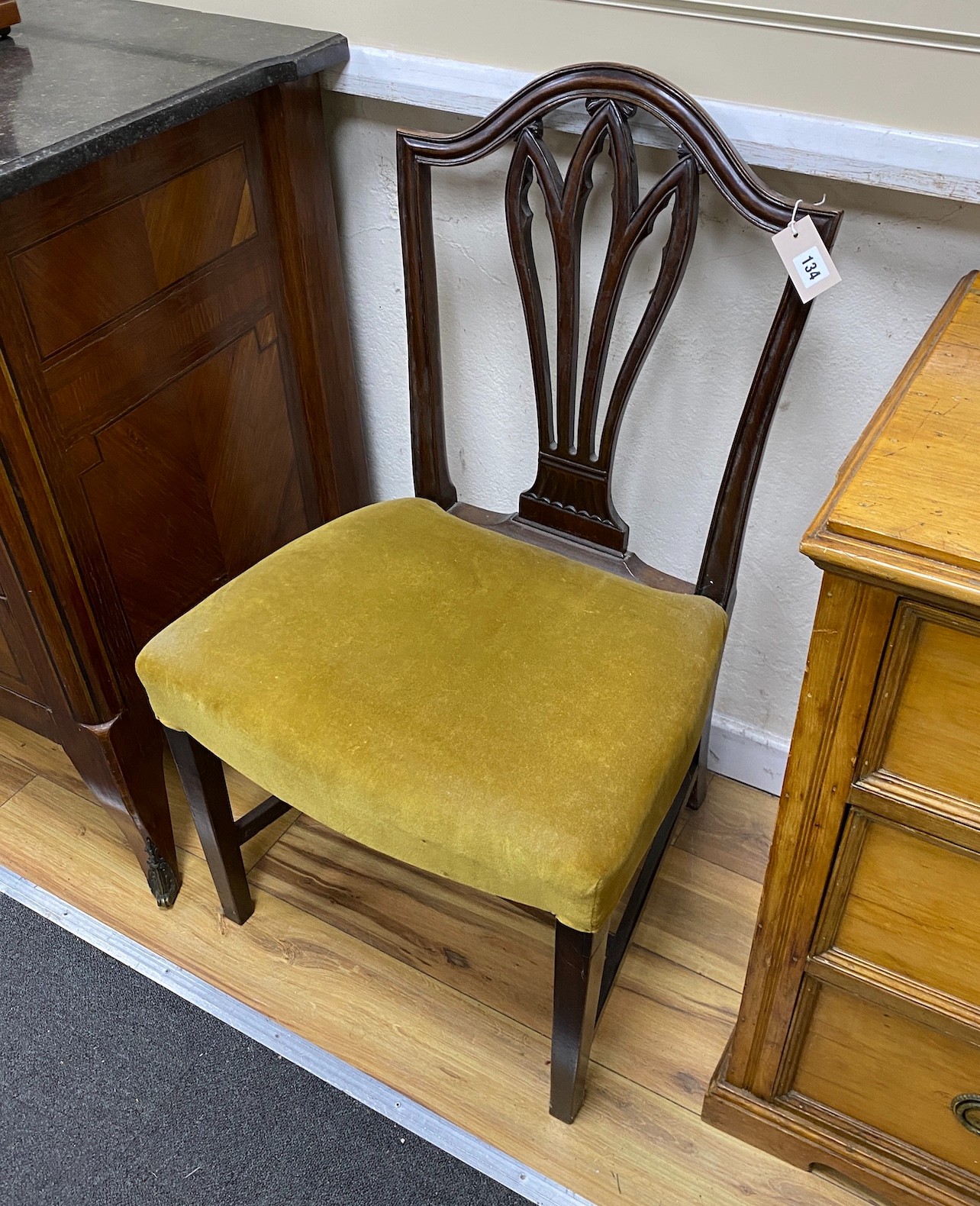 A pair of George III Hepplewhite style mahogany dining chairs, with stuff-over seats, on square tapering legs