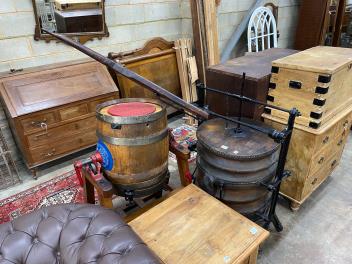 Lot 1180 , An 19th century cast iron oak and leather blacksmiths bellows by Linley and Son, Sheffield height 136cm.