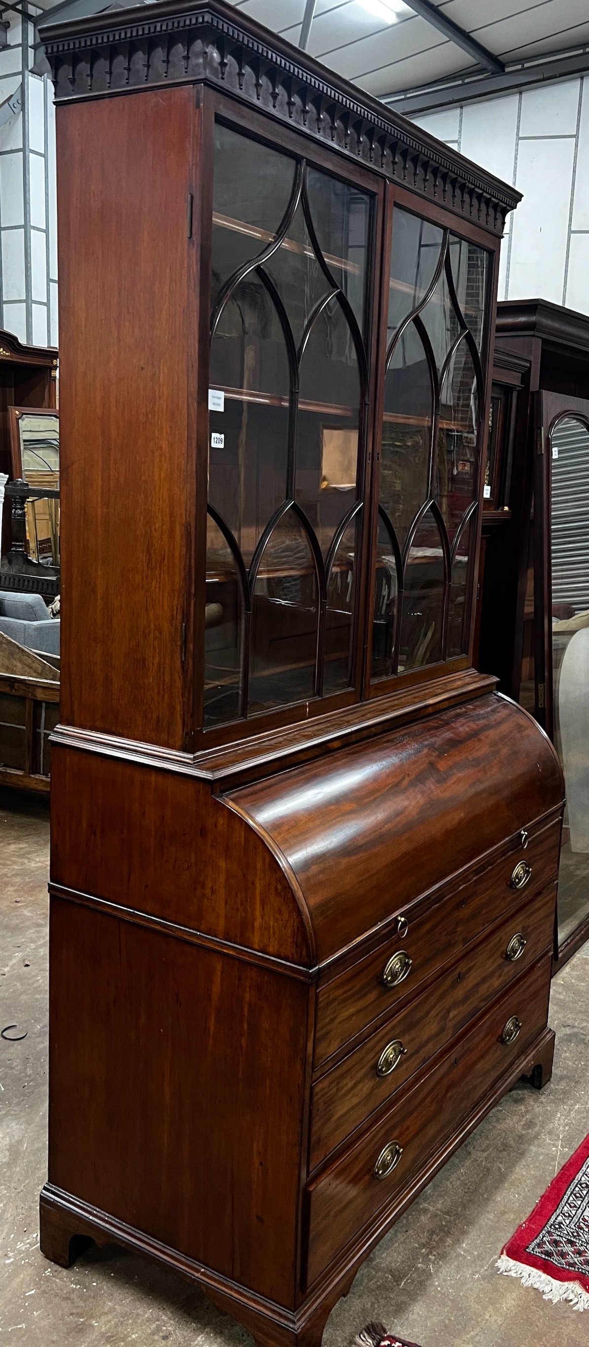 A George III mahogany cylinder bureau bookcase with glazed panelled doors, width 115cm, depth 60cm, height 227cm