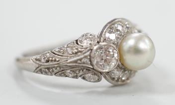 A white metal(stamped Platin), cultured pearl and diamond set circular cluster ring, size M, gross weight 5 grams.