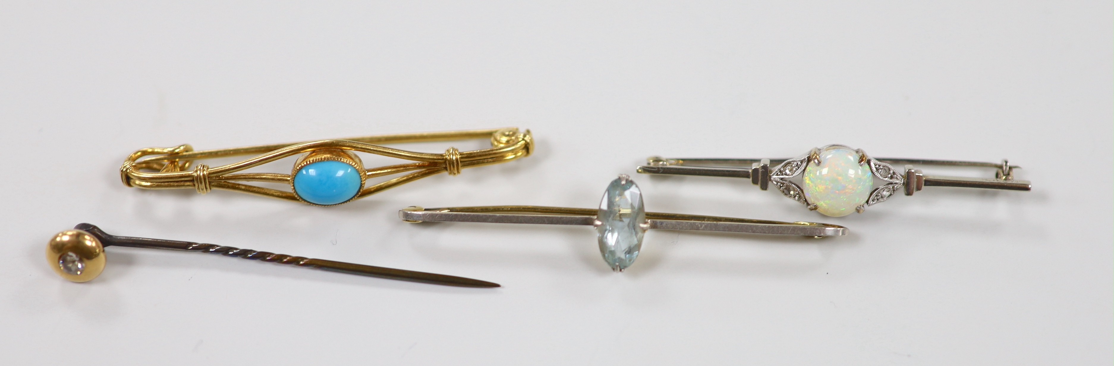 An Edwardian 15ct and single stone aquamarine set bar brooch, 58mm, gross 3.5 grams, two other bar brooches including a 9ct & plat, white opal and diamond chip and a diamond set stick pin, gross weight 11 grams.