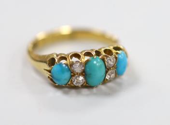 A late Victorian 18ct gold, three stone turquoise and four stone diamond set half hoop ring, size L, gross weight 3.9 grams.
