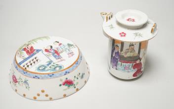 A Chinese famille rose teapot and a cover, together with a similar dish. 12cm tall