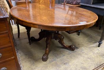 Lot 1104 , A Victorian oval figured walnut tilt top loo table, length 152cm, width 118cm, height 69cm