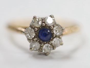 A yellow metal, sapphire and diamond set cluster ring, size N, gross weight 2.2 grams.