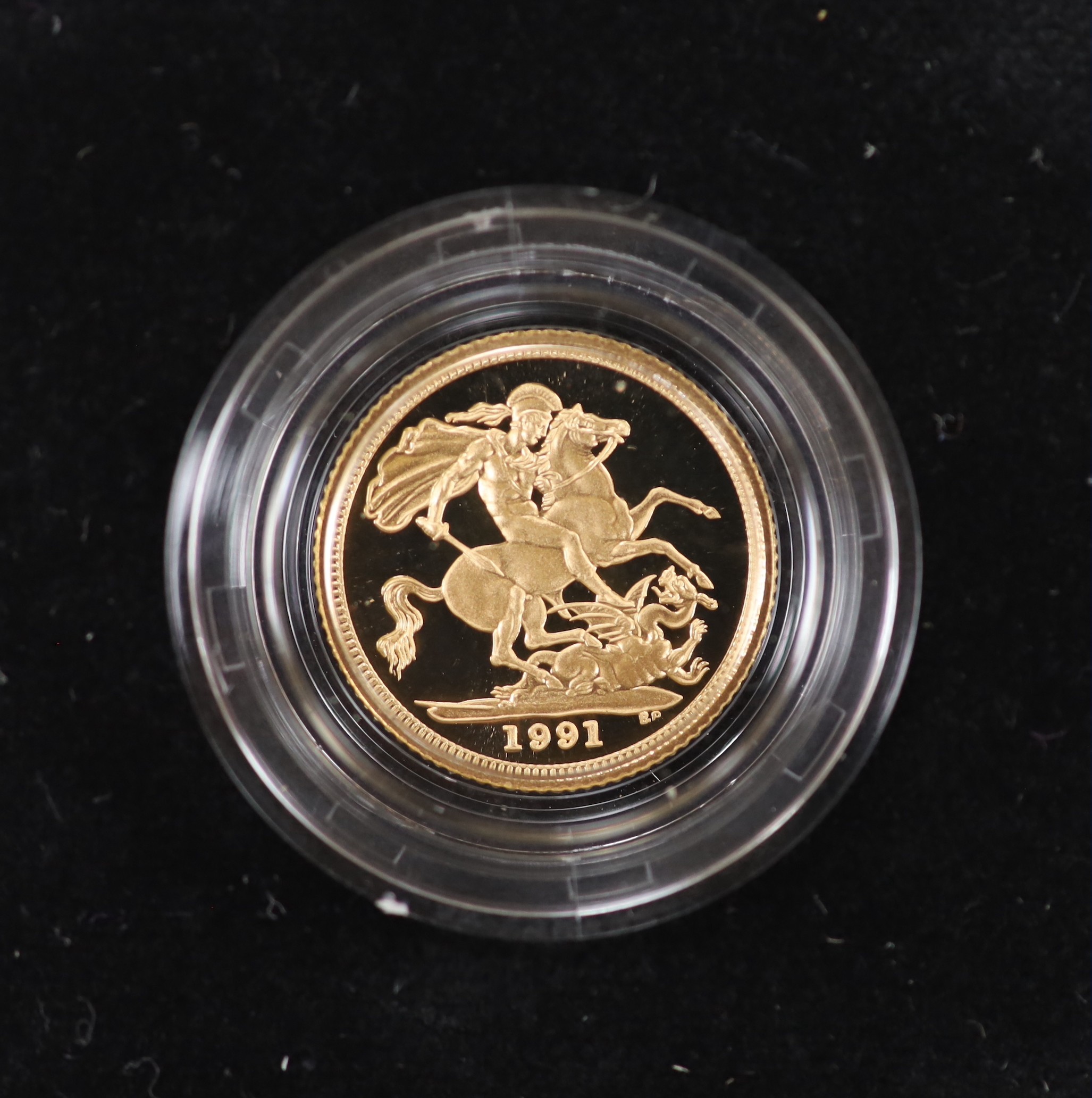 An Elizabeth II 1991 gold proof half sovereign, with box and certificate.