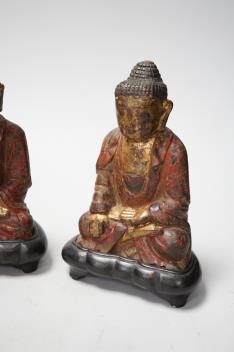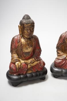 Lot 1264 , A set of three Chinese polychrome lacquered wood seated figures of Buddha, 19cm