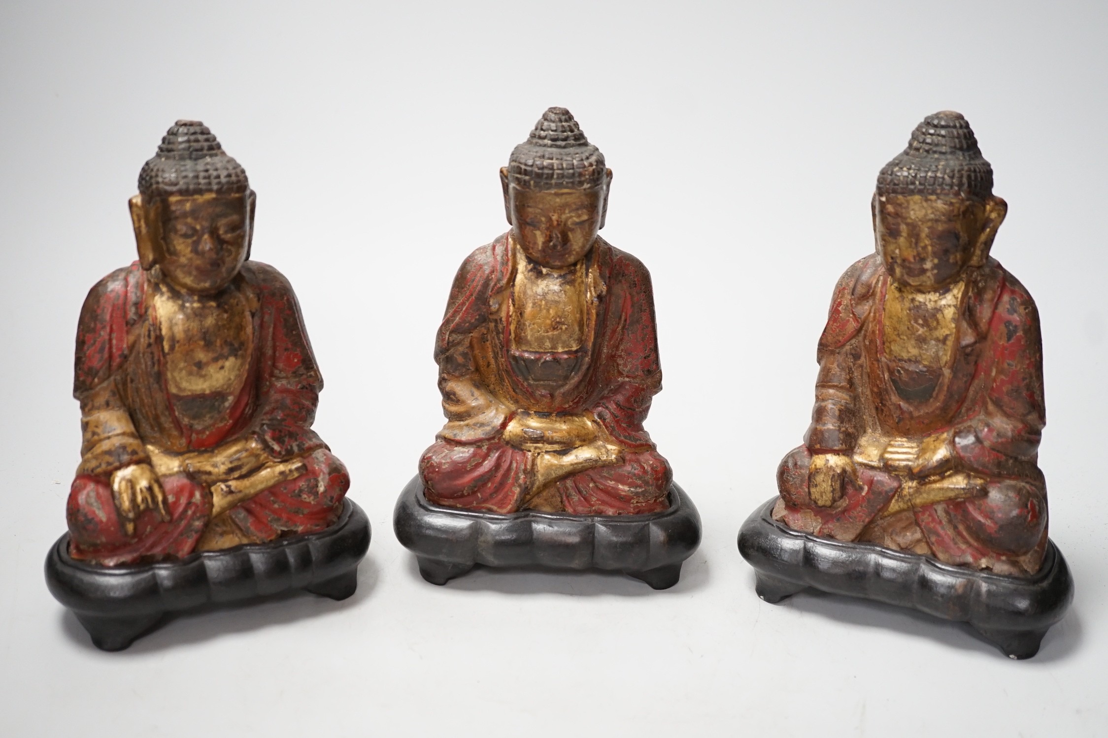 A set of three Chinese polychrome lacquered wood seated figures of Buddha, 19cm