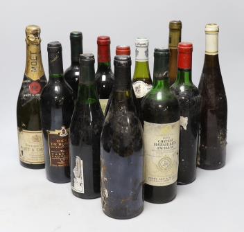 A bottle of Moët Chandon champagne and eleven various bottles of wine to include 1992 Jean Lafitte Bourgogne Rouge, 1994 Chateau L’Enclos Pomerol, 1975 Chateau Batailley Pauillac, 1994 Deen De Bortoli Cabernet Sauvignon etc.