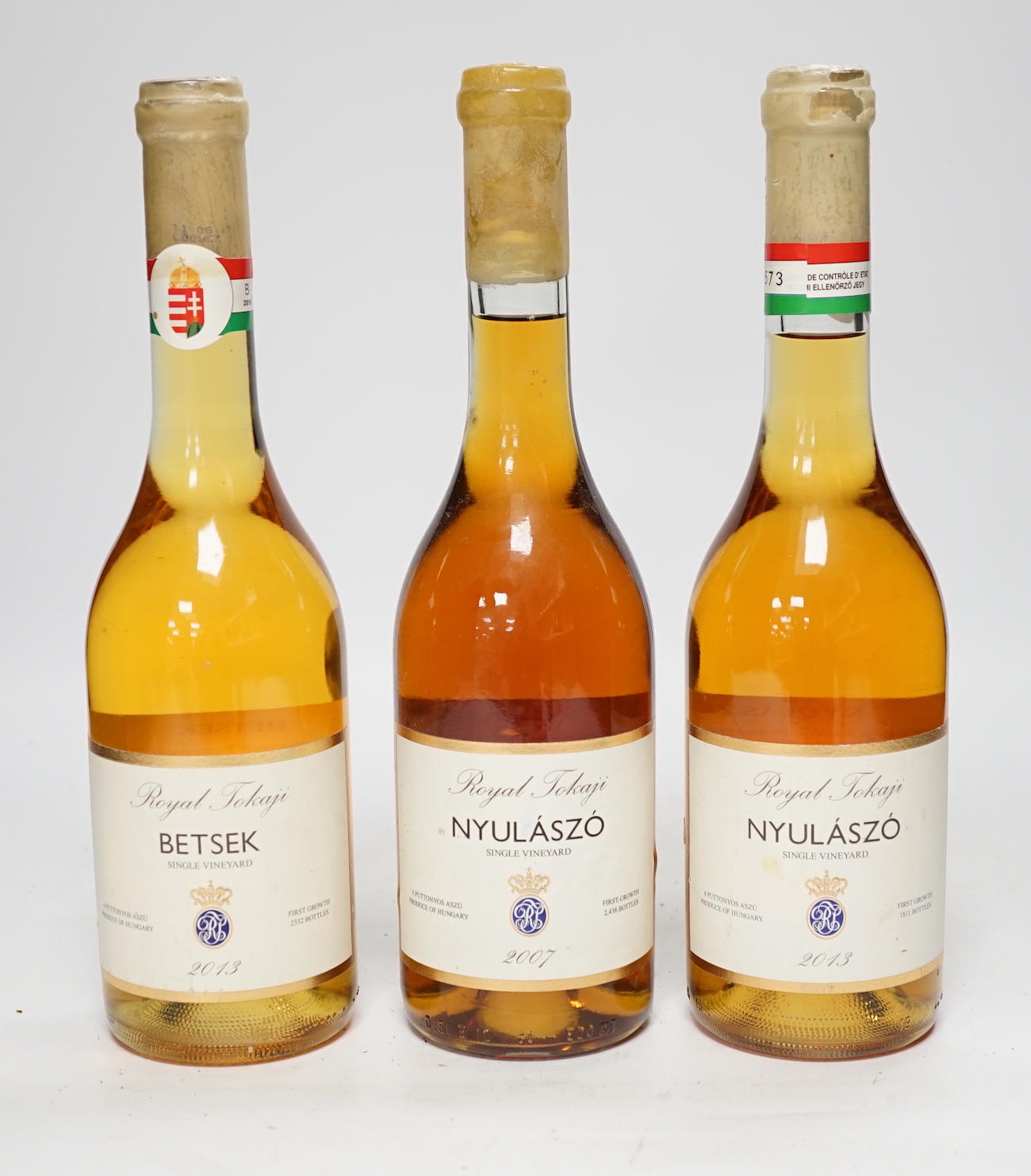 Three bottles of Royal Tokaji singke vineyard 6 puttonyos, each 50cl, Betsek 2013 and Nyulaszo 2007 & 2013.
