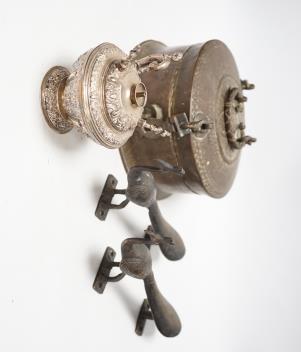 Lot 1447 , A hardwood stem hurricane lamp and assorted Indian brassware, lamp 71 cm high