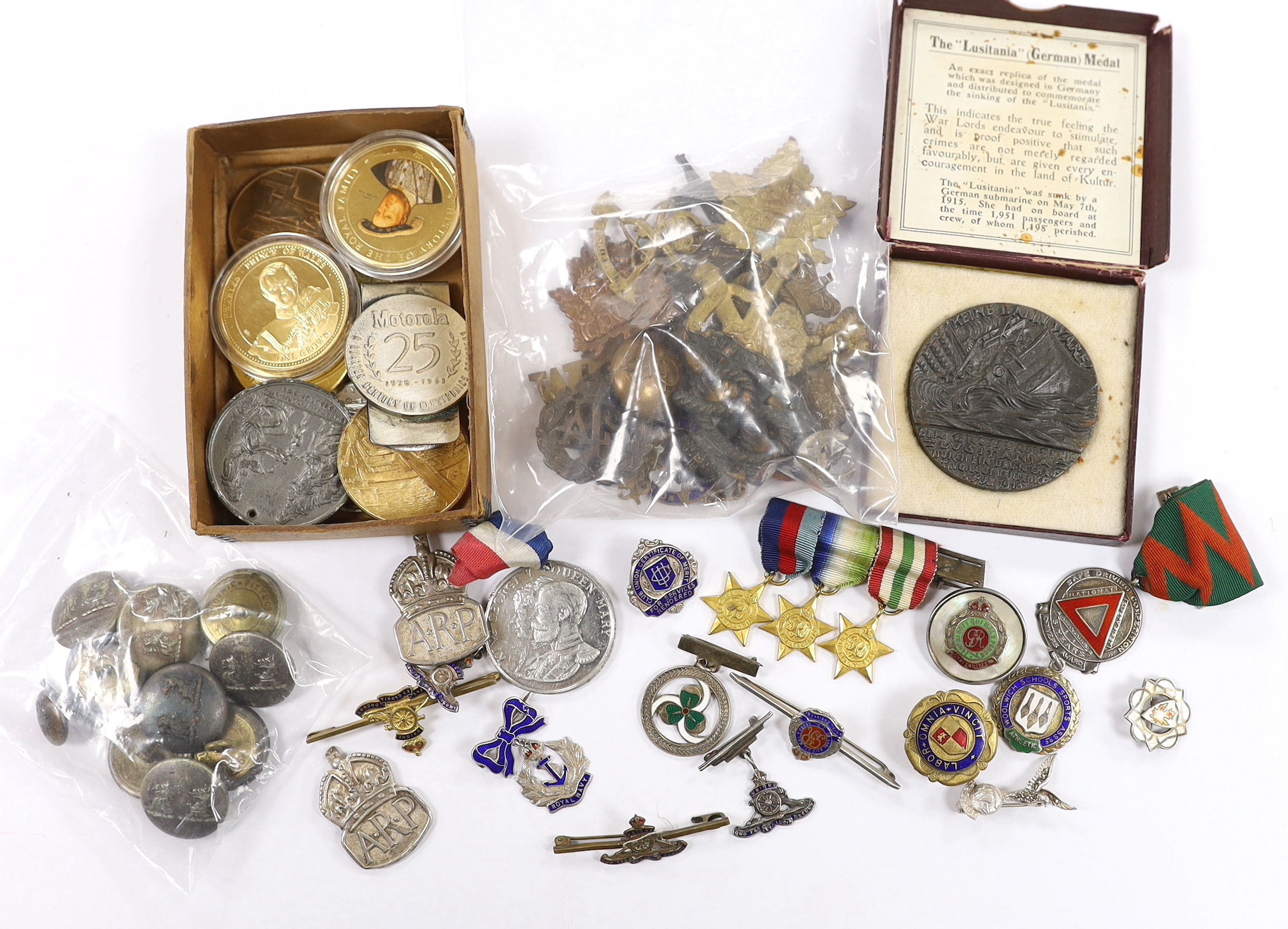 A collection of medals, cap badges, commemorative coins etc. including; a cased RMS Lusitania medal, Royal Artillery sweetheart brooches, a miniature WWII medal group of three stars; the 1939-45 Star, the Atlantic Star and the Italy Star, etc. also including; ARP lapel badges, a medal for the Silver Jubilee of George V, a small number of military cap badges and buttons, etc.