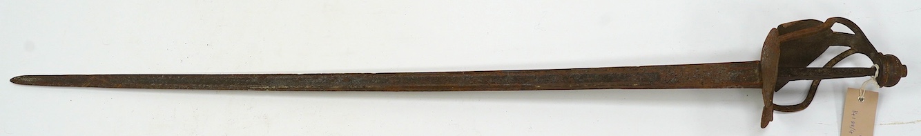 Lot 1313 , A British cavalry trooper’s sword, c.1750, straight single edged fullered blade, regulation iron hilt, with bun shaped pommel, blade 91.5cm. Condition - fair, rusted overall and grip missing