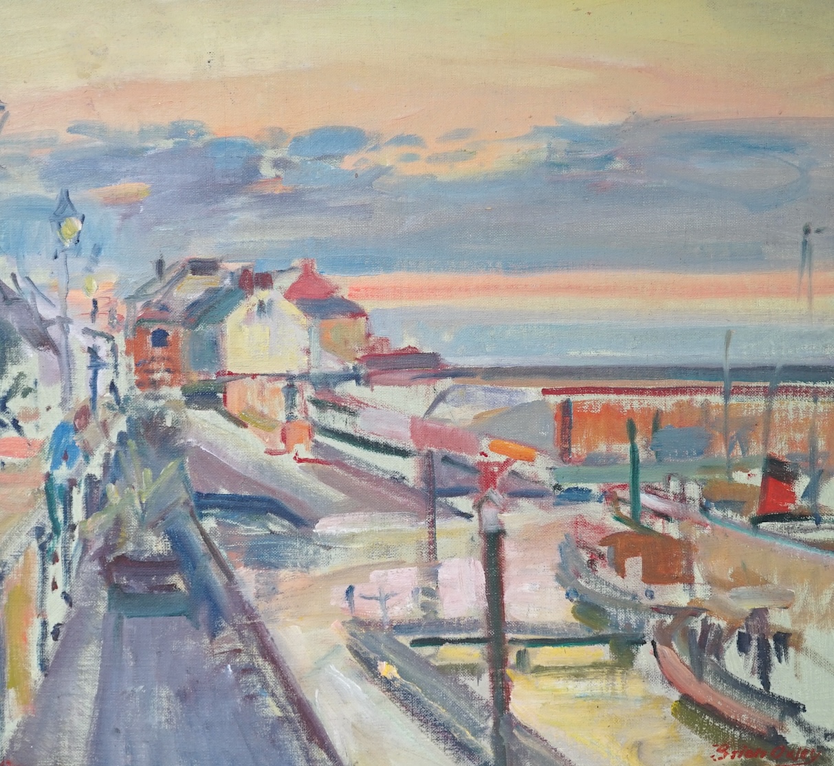 From the Studio of Fred Cuming. Brian Oxley (b.1943), oil on canvas board, Hythe, signed and dated 2012, 42 x 45cm. Condition - fair-good Note: “This is an interesting side lot of art and artistic ephemera from the extensive collection of Fred Cuming RA and his wife Audrey, who travelled and worked together around the UK and Europe. They were avid collectors of objects, anything curious or beautiful, many of these items would have caught their eye for some rare aesthetic or technical quality but quite often many items would simply have possessed a unique and naïve charm. There are several pieces that may have been the work of a student or amateur, nevertheless they found them exquisite. The majority of pieces from this small collection were displayed in their home for many years among an incredibly rich and varied array of his own work and that of his contemporaries. They would have been purchased over the course of a period spanning five decades or more, from the family’s early beginnings at Egerton House in Kent, Hythe, Wittersham and finally Iden in East Sussex where the family settled.”