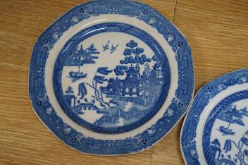 Lot 327 , Four early 19th century English pearlware blue and white plates, largest 23.5cm. Condition - fair