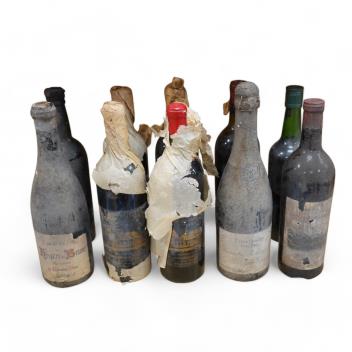 Lot 326 , Ten bottles of red wines to include six bottles of mixed Claret/Bordeaux, four bottles Chateau de Ville-George’s, Grand Cru 1959, two bottles of Chateau Leoville Barton 1947 and two others without labels, a bottle Cau de