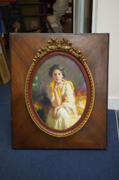 Lot 747 , A decorative Impressionist oval oil on board, Study of an Italian beauty, 38 x 28cm, ornately framed. Condition - good