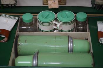 Lot 371 , An Art Deco, c.1930's cased picnic set with flasks, cutlery, plates and cups. Condition - poor