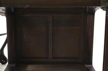 The table has some slight shrinkage to the rectangular panel on the top, otherwise in reasonable condition, one of the chairs has a small loss to one of the carved spandrels on the front leg and another which has been re-glued and now detached, otherwise in good condition.