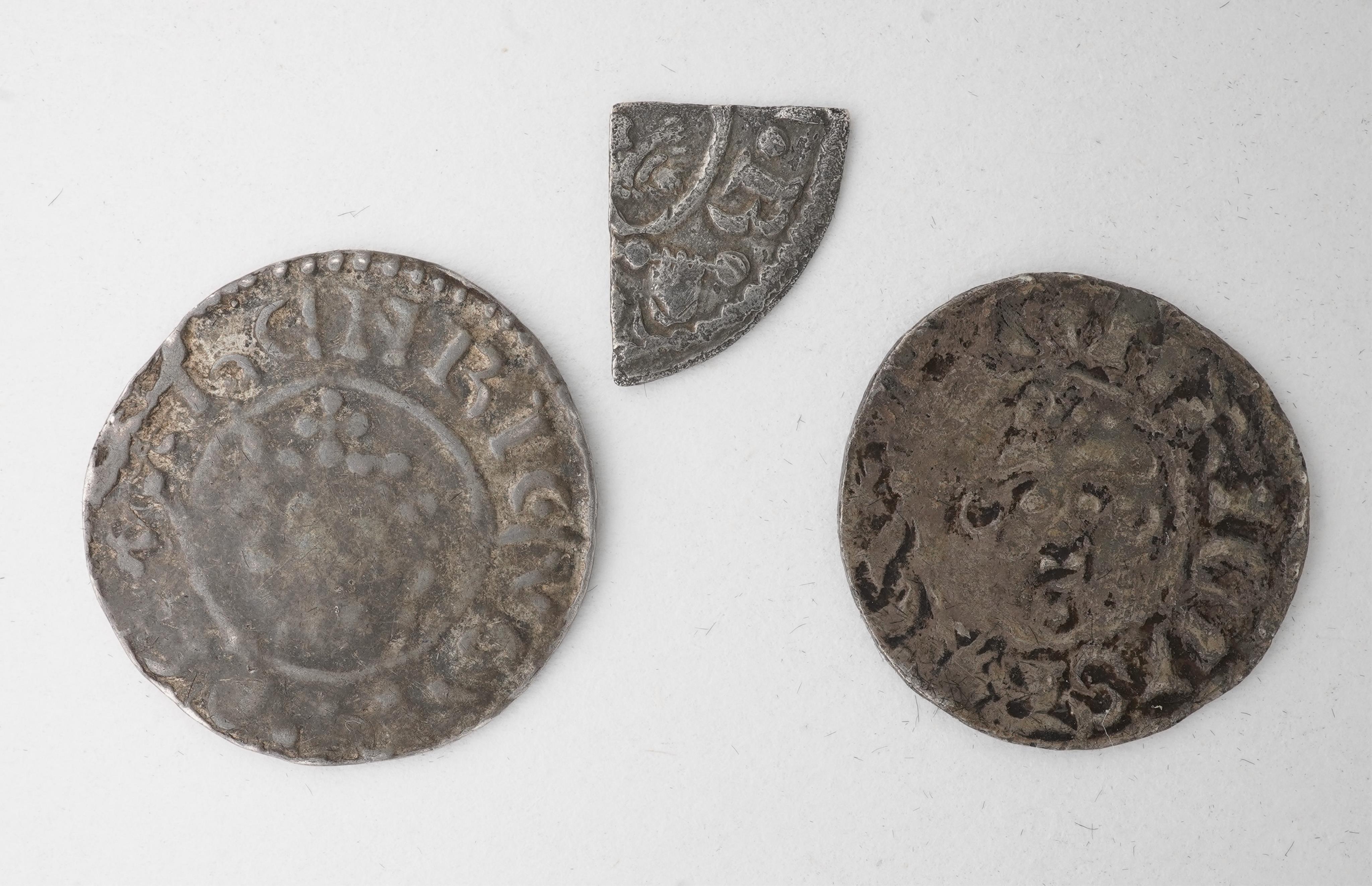 Lot 2051 , Three British hammered coins, Plantagenet Kings, Henry II (1154-1189), silver short cross penny, York, 1.4g, cut quarter penny, class 1b. Exeter or York, S. 1344, 0.3g, silver short cross penny, 1.3g (3)