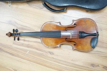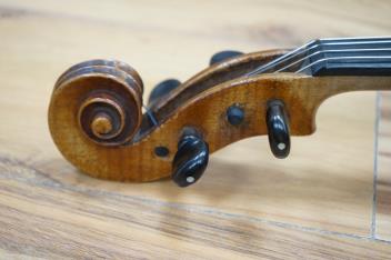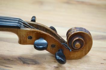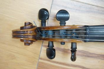 Light surface scratches top and bottom; some wear to varnish at underside; tailpiece is a plastic replacement; wear to underside of neck; one tuning peg replaced, one peg missing inset mother of pearl finial; no repairs or worm seen. Case cover with a split; and other faults.