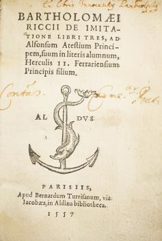 Lot 1339 , Riccius, Bartholomeaues - De Imitatione libri tres ad Alfonsum atestium principem suum in literis alumnum Hercules II. (?3rd edition) engraved title device, decorated initial letters, 104ff.; old vellum, 16mo. Paris: Ber