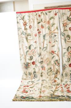 6)127cm wide x 394cm long-(295cm crewel panel, 4cm red band, 30cm cream panel, joined to 65cm cream panel) Condition - torn and mended edges, two lengths in manufacture. Pelmets have some white paint in places that may benefit with the curtains from conservation cleaning and restoring.