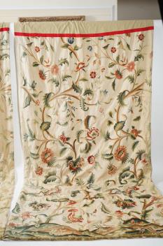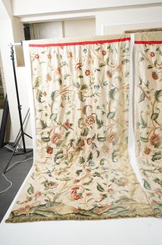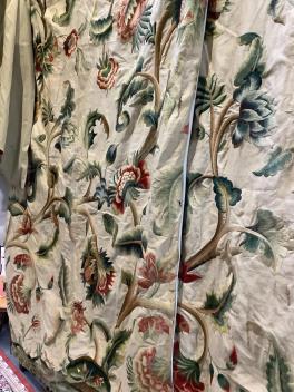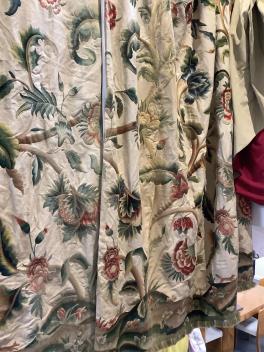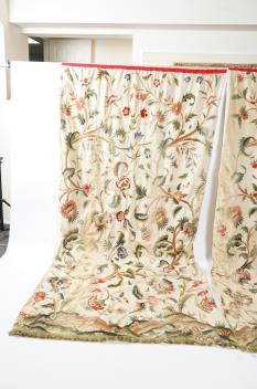Curtains: 1)170cm wide x 394cm long (305cm crewel panel, 4cm red band, 85cm cream top) Condition - large water marks